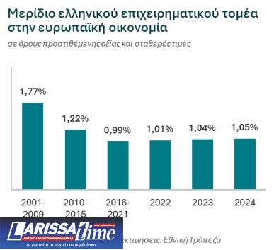 Υπό αυτά τα δεδομένα, ο επιχειρηματικός τομέας το 2024 εκτιμάται ότι θα έχει άνοδο πωλήσεων 2,8% (αντίστοιχη του 2023), με το 4ο τρίμηνο να ακολουθεί τη δυναμική του τελευταίου εξαμήνου (όπως φαίνεται από τα πρώτα στοιχεία για τον Οκτώβριο). Η επίδοση αυτή επιτρέπει στις ελληνικές επιχειρήσεις να συνεχίσουν την αργή αλλά σταθερή αύξηση του μεριδίου τους στην ΕΕ (σε 1,05% το 2024, από 1,01% το 2022, σε όρους προστιθέμενης αξίας), με σημαντικά όμως περιθώρια για την ανάκτηση του προ-κρίσης μεριδίου τους (1,8% κατά την περίοδο 2001-2009).