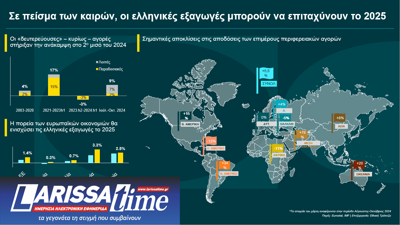 – Ενισχύεται η προοπτική διατηρήσιμης ανάκαμψης για τις ελληνικές εξαγωγές, καθώς η ευρωπαϊκή οικονομία εκτιμάται ότι θα επιταχύνει με ρυθμό 1,4% το 2025 (από +0,8% το 2024). Ανοδικές τάσεις αναμένονται κυρίως σε 4 βασικές μας αγορές: Γερμανία, Ιταλία, Ρουμανία και Βουλγαρία (οι οποίες αθροιστικά καλύπτουν το ⅓ των ελληνικών εξαγωγών). Η δυναμική αυτή αναμένεται να επιτρέψει στις ευρωπαϊκές εισαγωγές να ανακάμψουν το 2025 (+2,2%), ύστερα από διετή πτώση (της τάξης του -4% ετησίως).