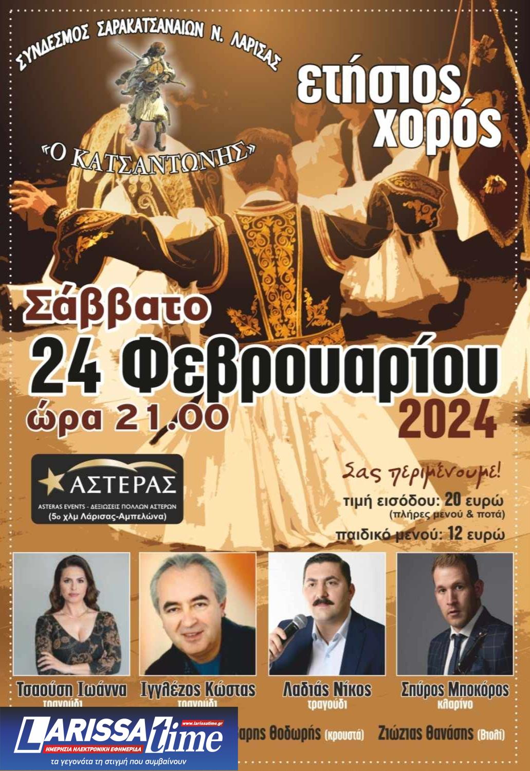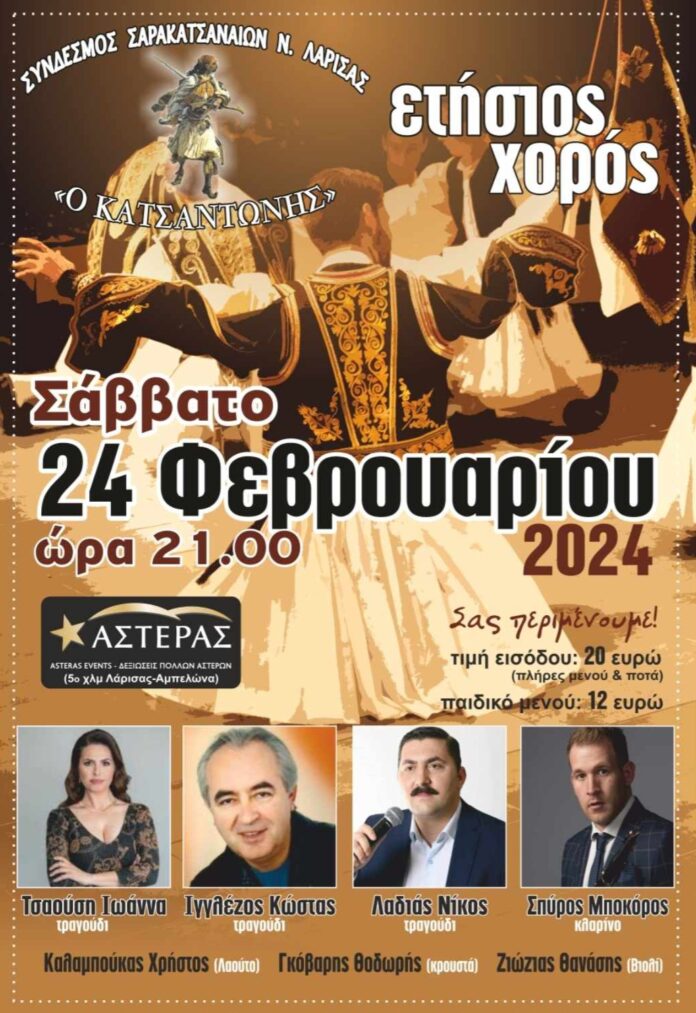 Ο Σύνδεσμος Σαρακατσαναίων Λάρισας “Ο ΚΑΤΣΑΝΤΩΝΗΣ” διοργανώνει την ετήσια χοροεσπερίδα του το Σάββατο 24 Φεβρουαρίου και ώρα 9:00 μ.μ. στο Κέντρο Εκδηλώσεων ΑΣΤΕΡΑΣ 5ο χλμ. Λάρισας – Αμπελώνα.