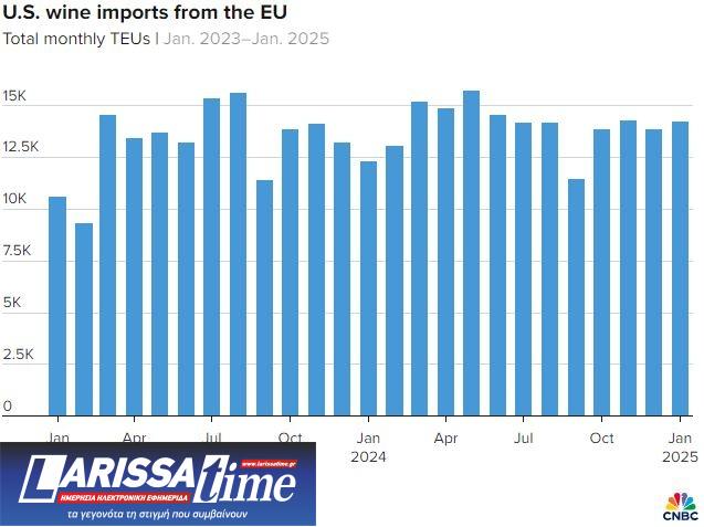 Οι Αμερικανοί που απολαμβάνουν το αφρώδες νερό τους, από ανθρακούχο νερό μέχρι Moet Hennessy, μπορεί επίσης να δουν μεγάλη αύξηση στο αγαπημένο τους ποτό. Το ανθρακούχο νερό από τέσσερα μεγάλα εμπορικά σήματα (Evian, Perrier, Pelligrino και Gerolstiner) παρουσιάζει κατά μέσο όρο 2400 μονάδες ισοδύναμου (TEU) το μήνα, σε ετήσια βάση. Συνολικά, οι εισαγωγές κρασιού ήταν 5,5 δισεκατομμύρια δολάρια το 2024, σύμφωνα με τον Τζορτζ. «Αυτό σημαίνει περίπου 14.000 εμπορευματοκιβώτια το μήνα από τις χώρες της ΕΕ. Σχεδόν το μισό πλοίο μεταφοράς εμπορευματοκιβωτίων».