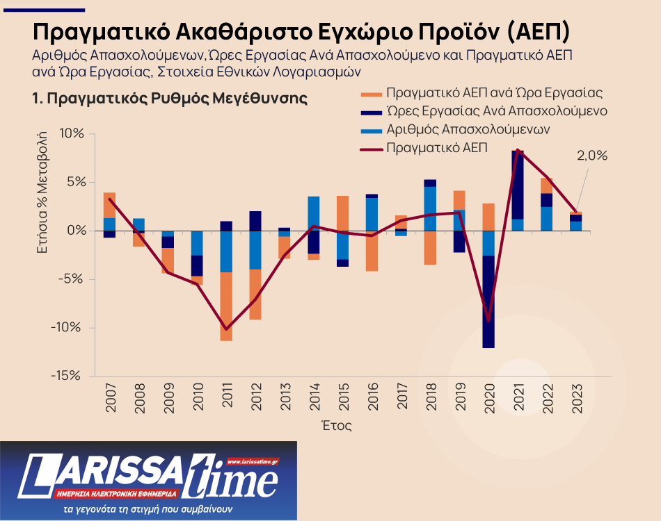 Αναλυτικά, όπως αναφέρουν οι ερευνητές της Eurobank, από την επεξεργασία στοιχείων των ετήσιων εθνικών λογαριασμών της ΕΛΣΤΑΤ προκύπτει ότι το 2023 «οι συνιστώσες της απασχόλησης και των ωρών εργασίας ανά απασχολούμενο είχαν τη μεγαλύτερη συνεισφορά στην αύξηση του πραγματικού ΑΕΠ στην Ελλάδα κατά 2,0% το 2023, ενώ ακολούθησε με σχετικά χαμηλή θετική συμβολή η συνιστώσα της παραγωγικότητας της εργασίας». Σημειώνεται δε ότι «η απόκλιση του πραγματικού ΑΕΠ στην Ελλάδα κατά -18,9% σε σύγκριση με τα προ κρίσης χρέους επίπεδα (2023 vs 2007) αντανακλάται κυρίως στην αντίστοιχη απόκλιση της παραγωγικότητας της εργασίας κατά -15,4%».