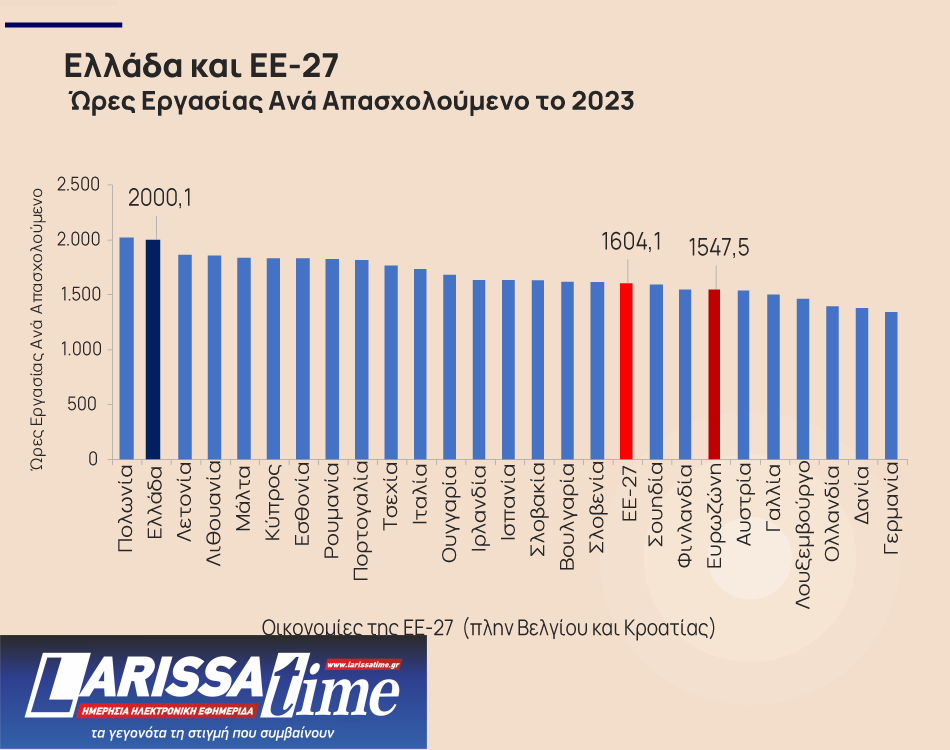 Οι ώρες εργασίας ανά απασχολούμενο στην Ελλάδα ανήλθαν στις 2.000,1 το 2023, κατατάσσοντας την ελληνική οικονομία στη δεύτερη θέση ανάμεσα στις χώρες της Ευρωπαϊκής Ένωσης των 27 κρατών μελών. Στην πρώτη θέση ήταν η Πολωνία με 2.019,5 ώρες ανά απασχολούμενο και ακολούθησαν: Ελλάδα (2.000,1), Λετονία (1.862,0), Λιθουανία (1.858,4), Μάλτα (1.835,9), Κύπρος (1.830,7), Εσθονία (1.829,6), Ρουμανία (1.825,9), Πορτογαλία (1.814,9), Τσεχία (1.765,8), Ιταλία (1.734,4), Ουγγαρία (1.679,2), Ιρλανδία (1.632,8), Ισπανία (1.632,3), Σλοβακία (1.630,9), Βουλγαρία (1.617,7), Σλοβενία (1.616,1), ΕΕ-27 (1.604,1), Σουηδία (1.591,5), Φινλανδία (1.548,3), Ευρωζώνη (1.547,5), Αυστρία (1.540,5), Γαλλία (1.500,2), Λουξεμβούργο (1.462,2), Ολλανδία (1.396,0), Δανία (1.380,2) και Γερμανία (1.342,4).