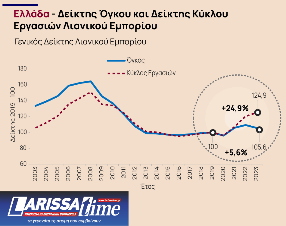 Σε σύγκριση με τα προ πανδημίας επίπεδα ο όγκος των πωλούμενων αγαθών στον λιανικό εμπόριο το 2023 ήταν ενισχυμένος κατά 5,6%, με τις κατηγορίες καταστημάτων των φαρμακευτικών-καλλυντικών, επίπλων-ηλεκτρικών ειδών-οικιακού εξοπλισμού και βιβλίων-χαρτικών-λοιπών ειδών να παρουσιάζουν τις υψηλότερες σωρευτικές αυξήσεις της τάξης του 47,6%, 33,3% και 29,2%. Τα εν λόγω αποτελέσματα συνδέονται σε έναν βαθμό με τις υστερόχρονες επιδράσεις της πανδημίας, με την αύξηση των επενδύσεων σε κατοικίες και με τις ανάγκες που δημιουργεί η ψηφιοποίηση της οικονομίας (στην κατηγορία βιβλίων-χαρτικών-λοιπών ειδών περιλαμβάνονται οι ηλεκτρονικοί υπολογιστές και ο τηλεπικοινωνιακός εξοπλισμός).