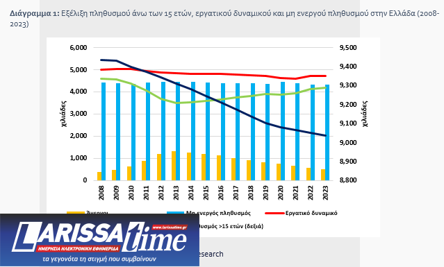 Οι απασχολούμενοι (Διάγραμμα 1) την περίοδο 2008-2013 κατά την οποία αυξήθηκε ραγδαία το ποσοστό ανεργίας μειώθηκαν κατά ¼ περίπου (23,8%) ή κατά 1,1 εκατ. (στα 3,51 εκατ. από τα 4,61 εκατ.) ενώ την περίοδο 2014-2023 κατά την οποία αποκλιμακώθηκε το ποσοστό ανεργίας αυξήθηκαν κατά 657,2 χιλ. ή 18,6% (στα 4,2 εκατ.). Συνολικά την περίοδο 2008-2023 περιορίστηκαν κατά 417,0 χιλ. άτομα (ή κατά 9,0%). Οι άνεργοι (Διάγραμμα 1) την περίοδο 2008-2013 υπερ-τριπλασιάστηκαν στα 1,33 εκατ. (από τους 387,9 χιλ.) και την περίοδο 2014-2023 μειώθηκαν στους 521,8 χιλ. (-59,1% ή -752,6 χιλ.), ενώ συνολικά την περίοδο 2008-2023 αυξήθηκαν κατά 34,5% ή 133,9 χιλ. Τέλος, ο μη ενεργός πληθυσμός (Διάγραμμα 1) την ίδια περίοδο συρρικνώθηκε από τα 4,44 εκατ. στα 4,32 εκατ. (-115,1 χιλ. ή -2,6%).