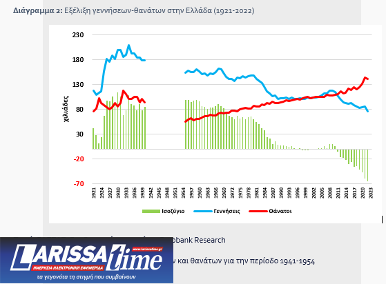 Την περίοδο 2008-2023 το ισοζύγιο γεννήσεων-θανάτων δεν φαίνεται να άσκησε κάποιο ρόλο στη μείωση του πληθυσμού με ηλικία άνω των 15 ετών. Ως προς το συγκεκριμένο θέμα σημειώνεται ότι την υπό εξέταση περίοδο ο συγκεκριμένος πληθυσμός αφορά άτομα που γεννήθηκαν μεταξύ 1919 και 2008, αλλά τα συντριπτικά περισσότερα έτη της συγκεκριμένης χρονικής περιόδου (1919-2008) το ισοζύγιο γεννήσεων-θανάτων ήταν θετικό αν και σε πτωτική πορεία μετά τα μέσα της δεκαετίας του 1960 (Διάγραμμα 2).