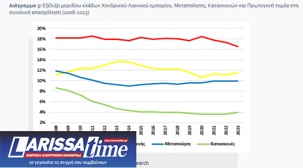 Σε αυτό το πλαίσιο σημειώνεται ότι την περίοδο 2008-2023 οι κλάδοι με τα υψηλότερα μερίδια στην συνολική απασχόληση ήταν το Χονδρικό-Λιανικό εμπόριο (17,9% της συνολικής απασχόλησης, κατά μέσο όρο), ο Πρωτογενής τομέας (12,1%), η Μεταποίηση (9,9%), η Δημόσια διοίκηση και άμυνα-Υποχρεωτική κοινωνική ασφάλιση (8,8%), οι Δραστηριότητες παροχής Καταλύματος-Εστίασης (8,4%), η Εκπαίδευση (7,9%) και η Υγεία-Κοινωνική μέριμνα (6,2%).