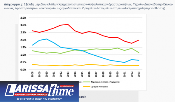 Τα μερίδια των κλάδων Τεχνών-Διασκέδασης-Επικοινωνίας και Δραστηριοτήτων νοικοκυριών ως εργοδοτών Δραστηριοτήτων νοικοκυριών ως εργοδοτών είναι διαχρονικά χαμηλά (1,3% και 1,2% κατά μέσο όρο, αντίστοιχα). Σε αμφότερους περιορίστηκαν την υπό εξέταση περίοδο, στον δεύτερο κλάδο περισσότερο (κατά 1,1 π.μ., από 1,7% σε 0,6%) συγκριτικά με τον πρώτο (κατά 0,1 π.μ., από 1,3% σε 1,2%) (Διάγραμμα 4). Ολοκληρώνοντας με τους κλάδους των οποίων το μερίδιο στη συνολική απασχόληση έχει συρρικνωθεί την περίοδο 2008-2023, στην περίπτωση των Ορυχείων-Λατομείων κατήλθε οριακά, δηλαδή στο 0,3% το 2023 από το 0,4% το 2008 (Διάγραμμα 4) αν και οι δείκτες κύκλου εργασιών και όγκου του συγκεκριμένου κλάδου παρουσίασαν πτώση κατά 11,7% και 35,5%, αντίστοιχα.