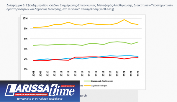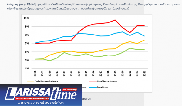 Παράλληλα, από την ανάλυση των καμπυλών που δείχνουν την εξέλιξη του μεριδίου των μονοψήφιων κλάδων στη συνολική απασχόληση της χώρας, προέκυψε ότι την περίοδο 2008-2023 παρουσιάστηκε άνοδος του μεριδίου στους περισσότερους εξ αυτών (14 από τους 21). Σε αυτούς περιλαμβάνονται μεταξύ άλλων οι κλάδοι Δημόσιας διοίκησης και άμυνας-Υποχρεωτικής κοινωνικής ασφάλισης, Δραστηριοτήτων υπηρεσιών παροχής καταλύματος και εστίασης, Εκπαίδευσης, Δραστηριοτήτων ανθρώπινης υγείας και κοινωνικής μέριμνας, Επαγγελματικών-Επιστημονικών-Τεχνικών δραστηριοτήτων, Μεταφοράς-Αποθήκευσης, Ενημέρωσης-Επικοινωνίας και Διοικητικών-Υποστηρικτικών δραστηριοτήτων.
