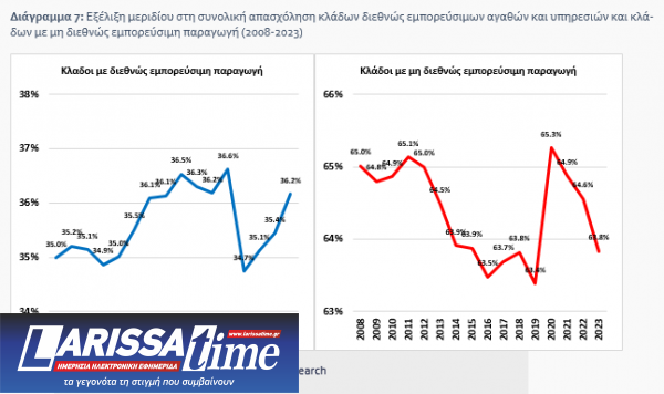 Ωστόσο, μια πιο προσεκτική ματιά στην εξέλιξη των μεριδίων απασχόλησης μεταξύ των κλάδων που παρουσιάζουν διεθνώς εμπορεύσιμη παραγωγή και αυτών που δεν παράγουν διεθνώς εμπορεύσιμα αγαθά και υπηρεσίες δείχνει ότι η πρώτη ομάδα κλάδων αύξησε ήπια το ποσοστό της στη συνολική απασχόληση την περίοδο 2008-2023, ενώ αντίστοιχα στη δεύτερη μειώθηκε.