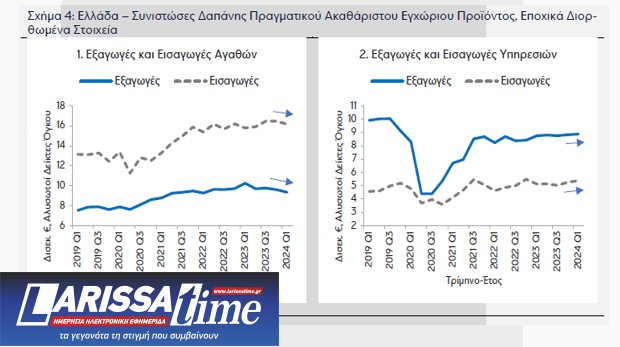 2ον, οι εισαγωγές, δηλαδή το σύνολο των αγαθών και υπηρεσιών που παράγονται στην αλλοδαπή αλλά αγοράζονται από φορείς της εγχώριας οικονομίας, σημείωσαν ρυθμό μεταβολής -0,6% QoQ / 3,1% ΥοΥ το α’ τρίμηνο 2024 από 0,9% QoQ / 0,0% ΥοΥ το δ’ τρίμηνο 2023. Τα τελευταία 4 τρίμηνα δηλαδή την περίοδο που οι εξαγωγές παρουσιάζουν κάμψη, οι εισαγωγές καταγράφουν μέση τριμηνιαία αύξηση κατά 0,8% (0,6% στα αγαθά και 1,2% στις υπηρεσίες). Σύμφωνα με τα στοιχεία του ισοζυγίου τρεχουσών συναλλαγών της Τραπέζης της Ελλάδος , η αύξηση των εισαγωγών αγαθών προέρχεται από την κατηγορία των προϊόντων εκτός καυσίμων και πλοίων.
