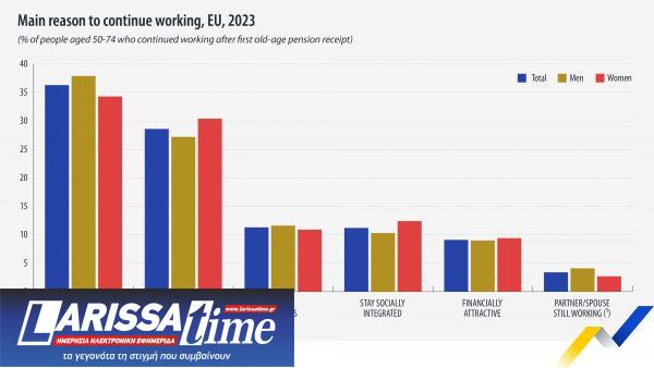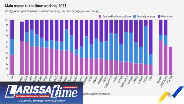Από την άλλη πλευρά, η οικονομική ανάγκη ήταν ο κύριος λόγος για τη συνέχιση της εργασίας στην Κύπρο (68,6%), τη Ρουμανία (54,3%) και τη Βουλγαρία (53,6%), ενώ η Σουηδία (9,4%), η Τσεχία (12,4%) και το Λουξεμβούργο (14,4%) κατέγραψαν το χαμηλότερο ποσοστό.
