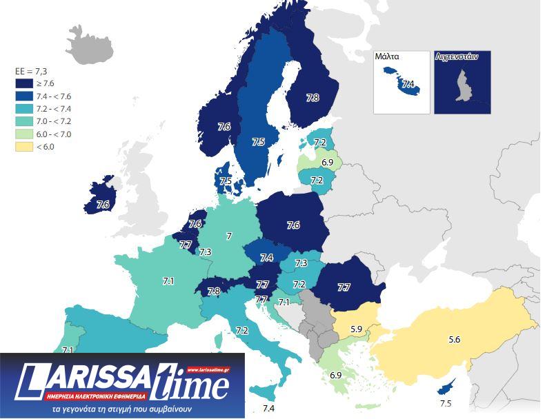 Συγκεκριμένα μεταξύ των 27 χωρών της ΕΕ, οι μισές είχαν βαθμολογίες πάνω από τον μέσο όρο της ΕΕ (7,3). Η Φινλανδία είχε την υψηλότερη βαθμολογία με 7,8, ακολουθούμενη από το Βέλγιο, την Αυστρία, τη Ρουμανία και τη Σλοβενία (η καθεμία με 7,7). Οι χαμηλότερες βαθμολογίες καταγράφηκαν στη Βουλγαρία (5,9), τη Λετονία και την Ελλάδα (και οι δύο 6,9).