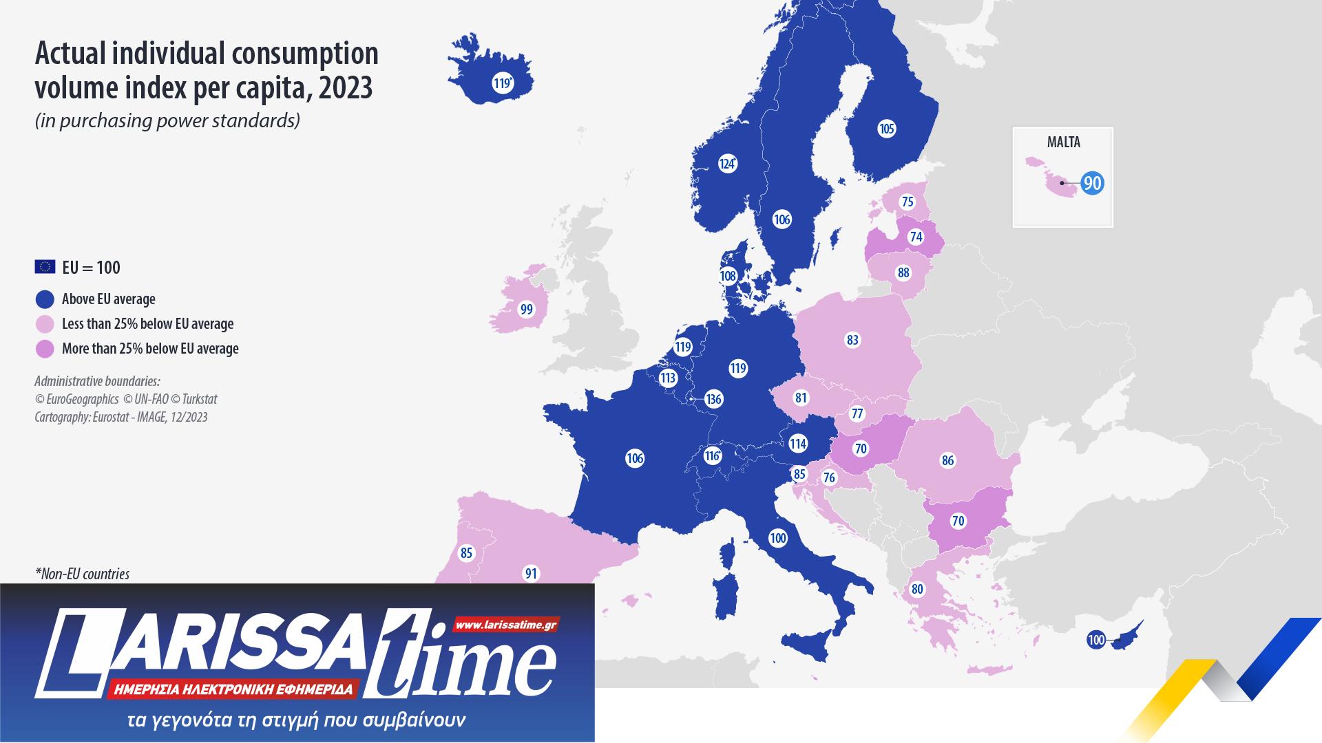 Σύμφωνα με στοιχεία της Eurostat, το κατά κεφαλήν ΑΕΠ ανήλθε στο 68% του μέσου όρου της ΕΕ (από 67% το 2022 και 66% το 2019) και ήταν υψηλότερο μόνο από αυτό της Βουλγαρίας, όπου αυξήθηκε στο 64% από 62% το 2022 και 55% το 2019. Ουσιαστικά η χώρα μας ανέβηκε κατά 1 μονάδα ενώ η Βουλγαρία κατά 2.