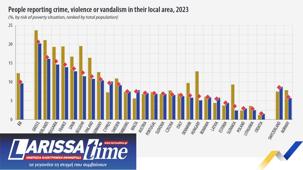 Η πρόσφατη έρευνα της Eurostat για το 2023 ανέδειξε την Ελλάδα ως τη χώρα με το υψηλότερο ποσοστό αναφορών περιστατικών εγκληματικότητας και βίας, τόσο μεταξύ ατόμων που διατρέχουν κίνδυνο φτώχειας όσο και αυτών που δεν βρίσκονται σε οικονομική δυσχέρεια.