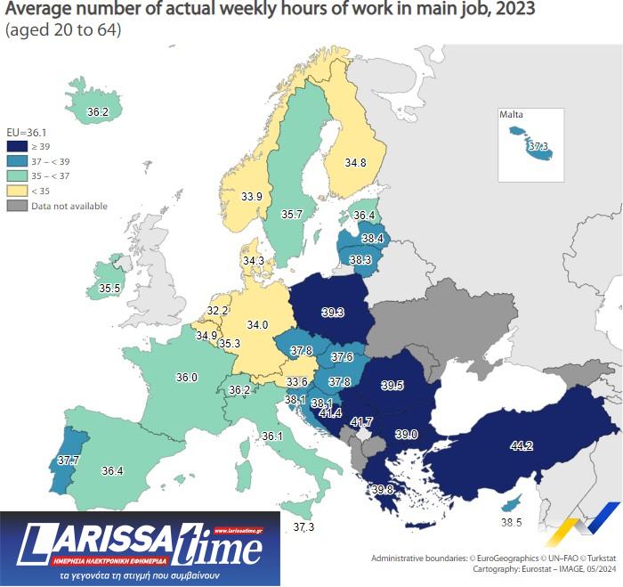 Όπως αποδείχθηκε την περσινή χρονιά, οι πραγματικές εβδομαδιαίες ώρες εργασίας των ατόμων ηλικίας 20-64 ετών στην κύρια εργασία τους, στην Ευρωπαϊκή Ένωση, ήταν κατά μέσο όρο 36,1 ώρες.