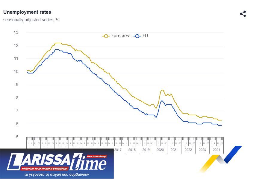 Σε σύγκριση με τον Νοέμβριο του 2023, η ανεργία μειώθηκε κατά 295.000 άτομα στην ΕΕ και 333.000 στην Ευρωζώνη.