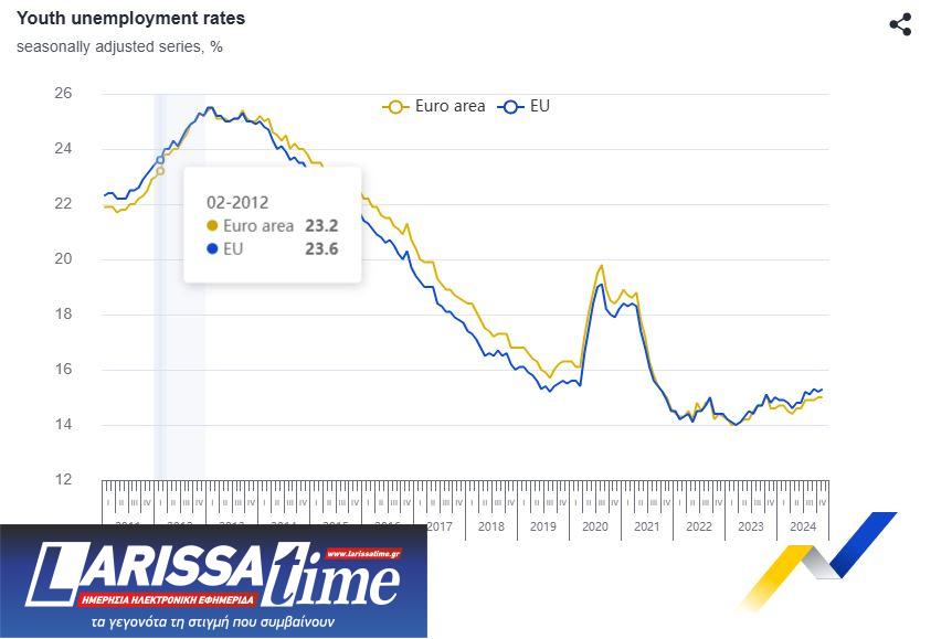 Τον Νοέμβριο του 2024 πάνω από 3 εκατ. νέοι (κάτω των 25 ετών) ήταν άνεργοι στην ΕΕ, εκ των οποίων τα 2,4 εκατ. στη ζώνη του ευρώ. Τον Νοέμβριο του 2024, το ποσοστό ανεργίας των νέων ήταν 15,3% στην ΕΕ, από 15,2% τον Οκτώβριο του 2024, και 15% στη ζώνη του ευρώ, σταθερό σε σχέση με τον προηγούμενο μήνα.