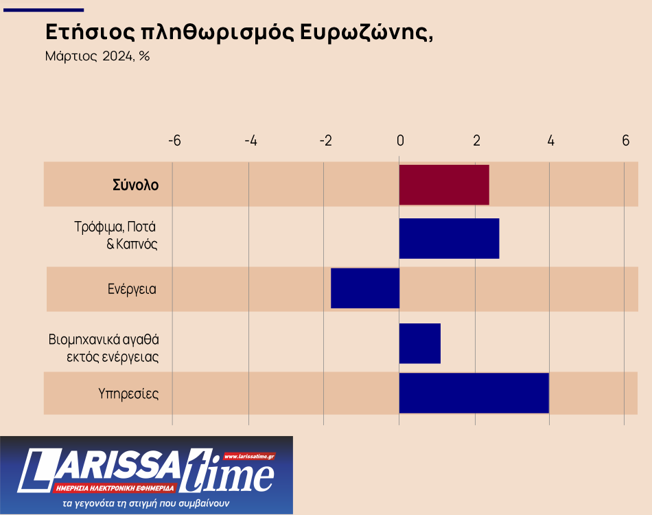Εξετάζοντας τις κύριες συνιστώσες του πληθωρισμού της ζώνης του ευρώ, οι υπηρεσίες αναμένεται να έχουν τον υψηλότερο ετήσιο ρυθμό τον Μάρτιο (4,0%, σταθερός σε σχέση με τον Φεβρουάριο), ακολουθούμενες από τα τρόφιμα, το αλκοόλ και τον καπνό (2,7%, έναντι 3,9% τον Φεβρουάριο), τα μη ενεργειακά βιομηχανικά αγαθά (1,1%, έναντι 1,6% τον Φεβρουάριο) και την ενέργεια (-1,8%, έναντι -3,7% τον Φεβρουάριο).