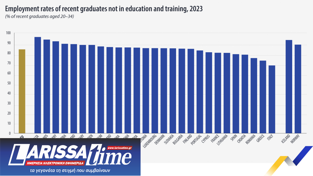 Συγκεκριμένα, το ποσοστό απασχόλησης των νέων ηλικίας 20-34 ετών που ολοκλήρωσαν τις σπουδές τους σε μεσαίο ή τριτοβάθμιο επίπεδο τα τελευταία 1-3 χρόνια ήταν 72,3% το 2023 έναντι 83,5% κατά μέσο όρο στην ΕΕ.