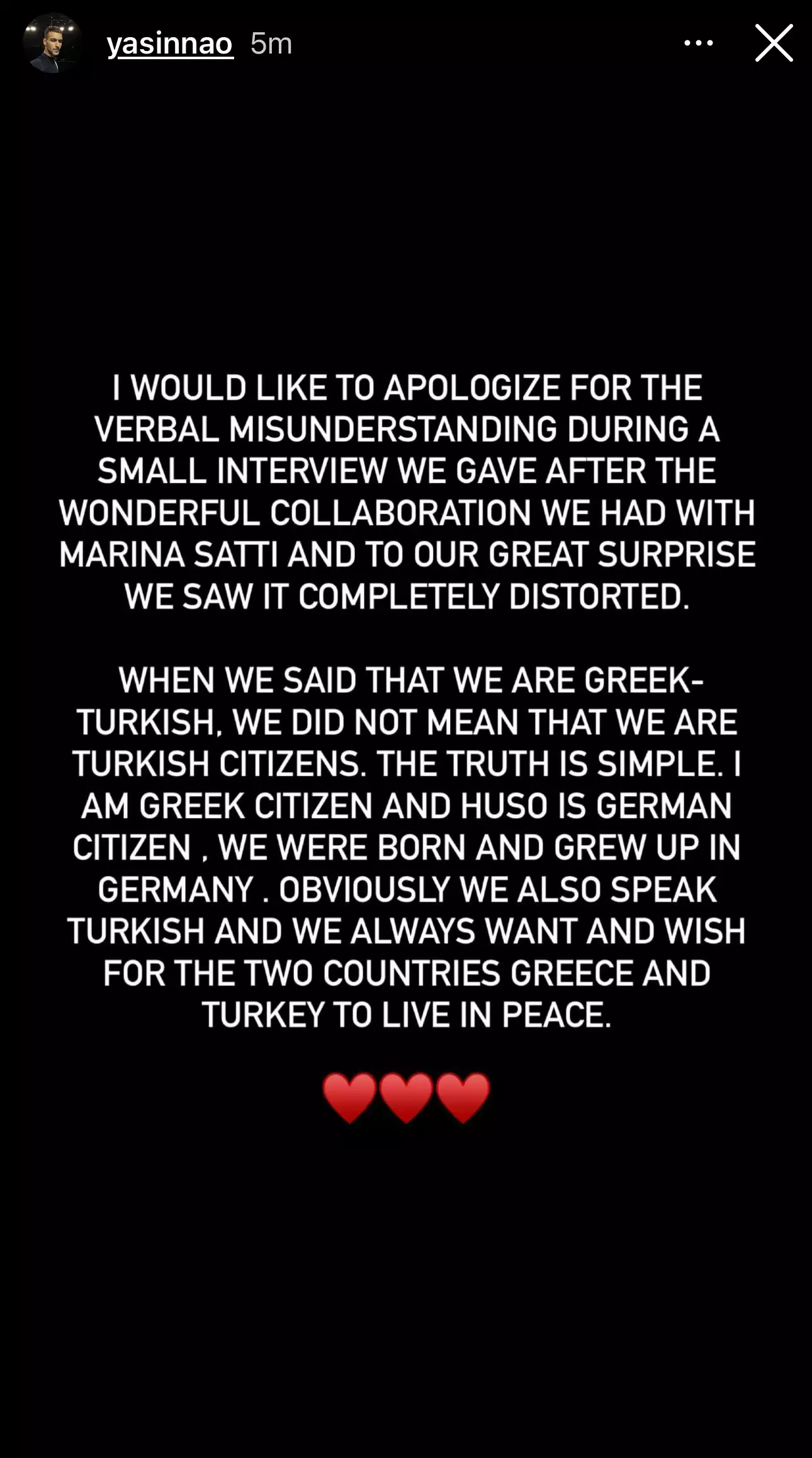 Όταν είπαμε ότι είμαστε “Έλληνες-Τούρκοι πολίτες”, δεν εννοούσαμε ότι είμαστε Τούρκοι πολίτες. Η αλήθεια είναι απλή. Εγώ είμαι Έλληνας πολίτης και ο Huso Γερμανός πολίτης που γεννηθήκαμε και μεγαλώσαμε στη Γερμανία. Προφανώς μιλάμε και τουρκικά και πάντα θέλουμε και ευχόμαστε οι δύο χώρες Ελλάδα και Τουρκία να έχουν ειρήνη».