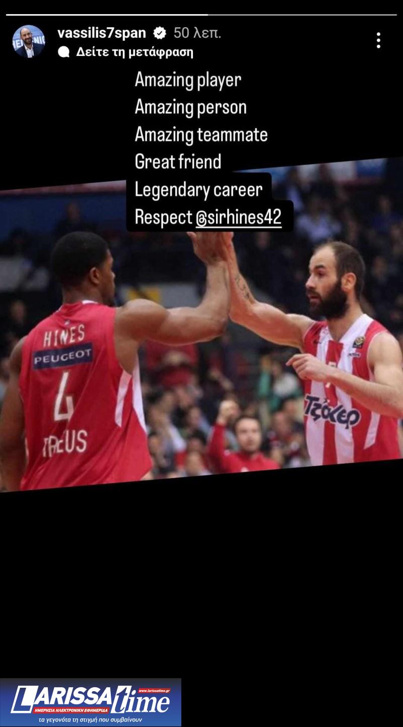 «Αποσύρεσαι από το μπάσκετ, αλλά όχι από τις αναμνήσεις μας. Είμαστε τόσο ευγνώμονες για όλα όσα πρόσφερες στον Ολυμπιακό και στο μπάσκετ γενικότερα. Ήσουν ένας σπουδαίος παίκτης και είσαι ακόμα πιο σπουδαίος άνθρωπος. Είμαστε περήφανοι που ήσουν και είσαι μέλος της ερυθρόλευκης οικογένειας. Απόλαυσε την απόσυρση από την ενεργό δράση. Και απόλαυσε όλες τις συναρπαστικές περιπέτειες που ακολουθούν…» ήταν το χαρακτηριστικό μήνυμα στα social media.