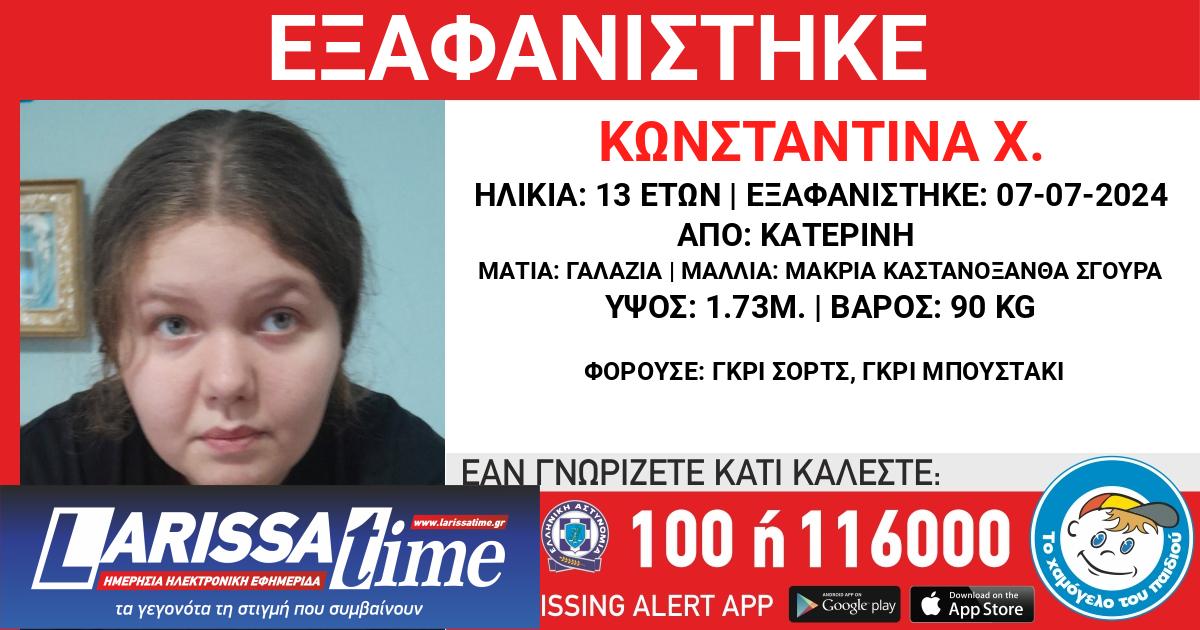 Συναγερμός σήμανε στις Αρχές καθώς σήμερα Κυριακή 7 Ιουλίου στις 06:00 εξαφανίστηκε από το σπίτι της στην Κατερίνη, η 13χρονη Κωνσταντίνα Χ.
