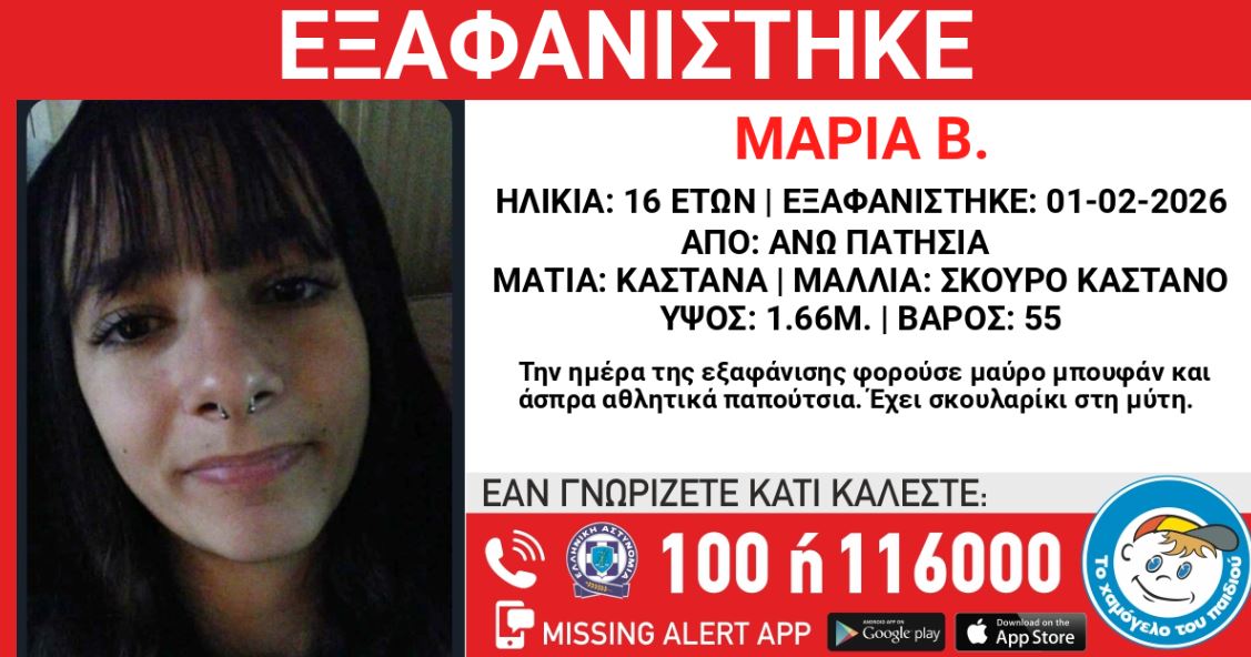 «Το Χαμόγελο του Παιδιού» ενημερώθηκε στις 1/2/2026 και προχώρησε άμεσα στη δημοσιοποίηση των στοιχείων της ανήλικης κατόπιν αιτήματος της οικογένειας, καθώς ενδέχεται να συντρέχουν λόγοι που θέτουν την ζωή της σε κίνδυνο.