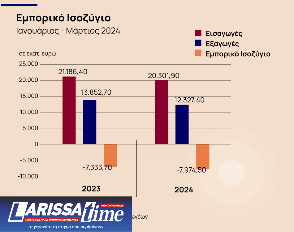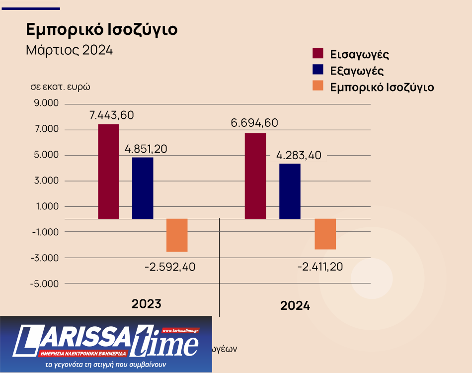 Ως αποτέλεσμα των παραπάνω, το εμπορικό έλλειμμα στο διάστημα Ιανουαρίου-Μαρτίου του 2024 αυξήθηκε κατά 640,8 εκ. ευρώ ή κατά 8,7%, στα 7,97 δισ. ευρώ από 7,33 δισ. ευρώ το πρώτο τρίμηνο του 2023. Χωρίς τα πετρελαιοειδή, το εμπορικό έλλειμμα αυξήθηκε ακόμη περισσότερο στα 6,50 δισ. ευρώ από 5,68 δισ. ευρώ, δηλαδή διογκώθηκε κατά 826,1 εκ. ευρώ ή κατά 14,5%.