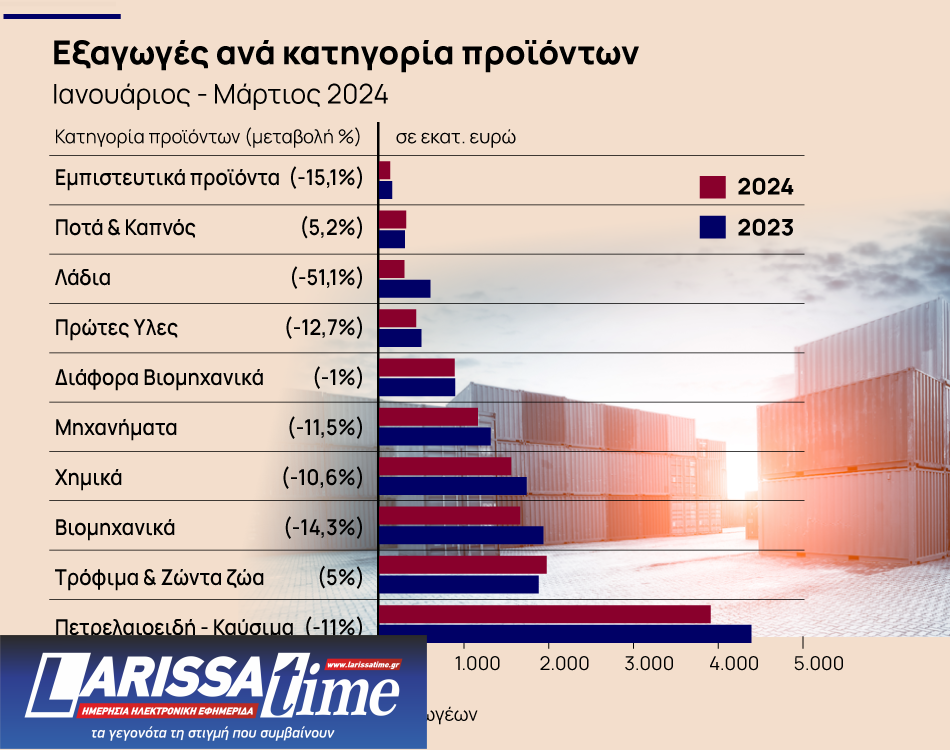 Σχετικά με τις μεγάλες κατηγορίες προϊόντων, το Μάρτιο του 2024 καταγράφονται αυξητικές τάσεις σε 2 μόνο από τους κυριότερους κλάδους. Πιο συγκεκριμένα, ποσοστιαία αύξηση καταγράφεται στις υψηλές σε αξία κατηγορίες: Πετρελαιοειδή-Καύσιμα (4,9%) και Διάφορα Βιομηχανικά (-8,2%).