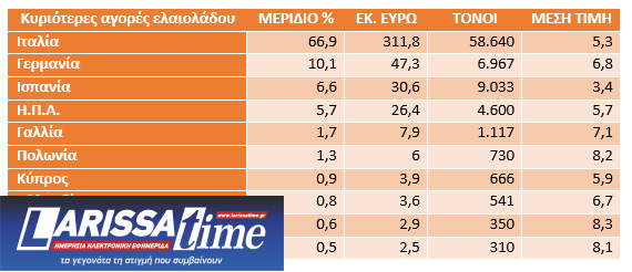 Στις αγορές του κρητικού ελαιολάδου πρώτη έρχεται η Ιταλία με 311,8 εκ. ευρώ, δεύτερη η Γερμανία με 47,3 εκ. ευρώ και ακολουθούν η Ισπανία, οι Η.Π.Α. και η Γαλλία.