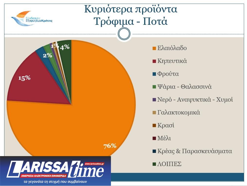 Στον αγροδιατροφικό τομέα, το Ελαιόλαδο έφτασε τα 466,3 εκ. ευρώ, καταλαμβάνοντας το 52,7% του συνόλου των κρητικών εξαγόμενων προϊόντων και το 76% στην κατηγορία των Τροφίμων & Ποτών, με αύξηση 69,5% σε σχέση με το περυσινό αντίστοιχο διάστημα. Τα Κηπευτικά έφτασαν τα 89,6 εκ. ευρώ με αύξηση 18,5%, τα Φρούτα τα 13,9 εκ. ευρώ και αύξηση 3% και με μικρότερα ποσοστά ακολουθούν τα Ψάρια & Θαλασσινά, η κατηγορία των Νερών – Αναψυκτικών – Χυμών, τα Γαλακτοκομικά, το Κρασί, το Μέλι και το Κρέας & Παρασκευάσματά του.