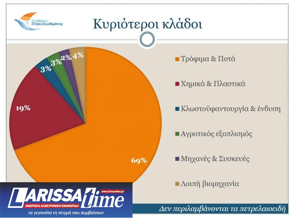 Ο κλάδος των Τροφίμων και Ποτών, ο οποίος αποτελεί το 69,3% του συνόλου των Κρητικών εξαγωγών με 613,6 εκ. ευρώ, παρουσιάζει αύξηση ίση με 50,8%. Ο κλάδος των Χημικών & Πλαστικών έρχεται δεύτερος, με μερίδιο 19,2% επί του συνόλου των εξαγωγών της Κρήτης και μείωση της τάξεως του 5,6%. Ακολουθούν οι κλάδοι της Κλωστοϋφαντουργίας & Ένδυσης (μερίδιο 3,1% και μείωση 4,9%), του Αγροτικού Εξοπλισμού (μερίδιο 2,8% και μείωση 11,9%) και με μικρότερα μερίδια οι Μηχανές & Συσκευές, τα Δομικά Υλικά και τα λοιπά βιομηχανικά προϊόντα.