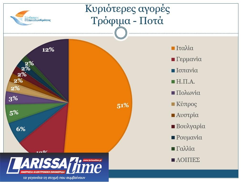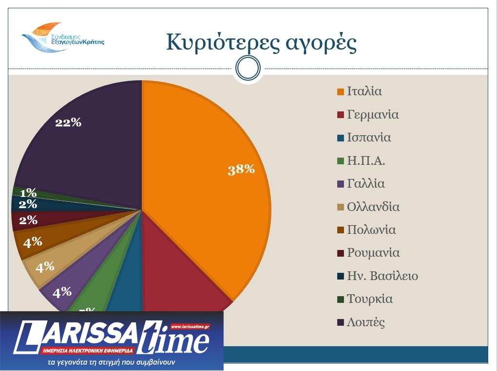 Σχετικά με τις αγορές, οι κυριότεροι αγοραστές των Κρητικών προϊόντων είναι η Ιταλία (332,4 εκ. ευρώ και μερίδιο 37,5%), η Γερμανία (108,6 εκ. ευρώ και μερίδιο 12,3%), η Ισπανία (20,3 εκ. ευρώ, μερίδιο 5,7%), οι Η.Π.Α. (40,4 εκ. ευρώ, μερίδιο 4,6%) και η Γαλλία (39,2 εκ. ευρώ και μερίδιο 4,4%). Τη δεκάδα των κυριότερων αγοραστών κλείνουν η Ολλανδία, η Πολωνία, η Ρουμανία, το Ηνωμένο Βασίλειο και η Τουρκία.