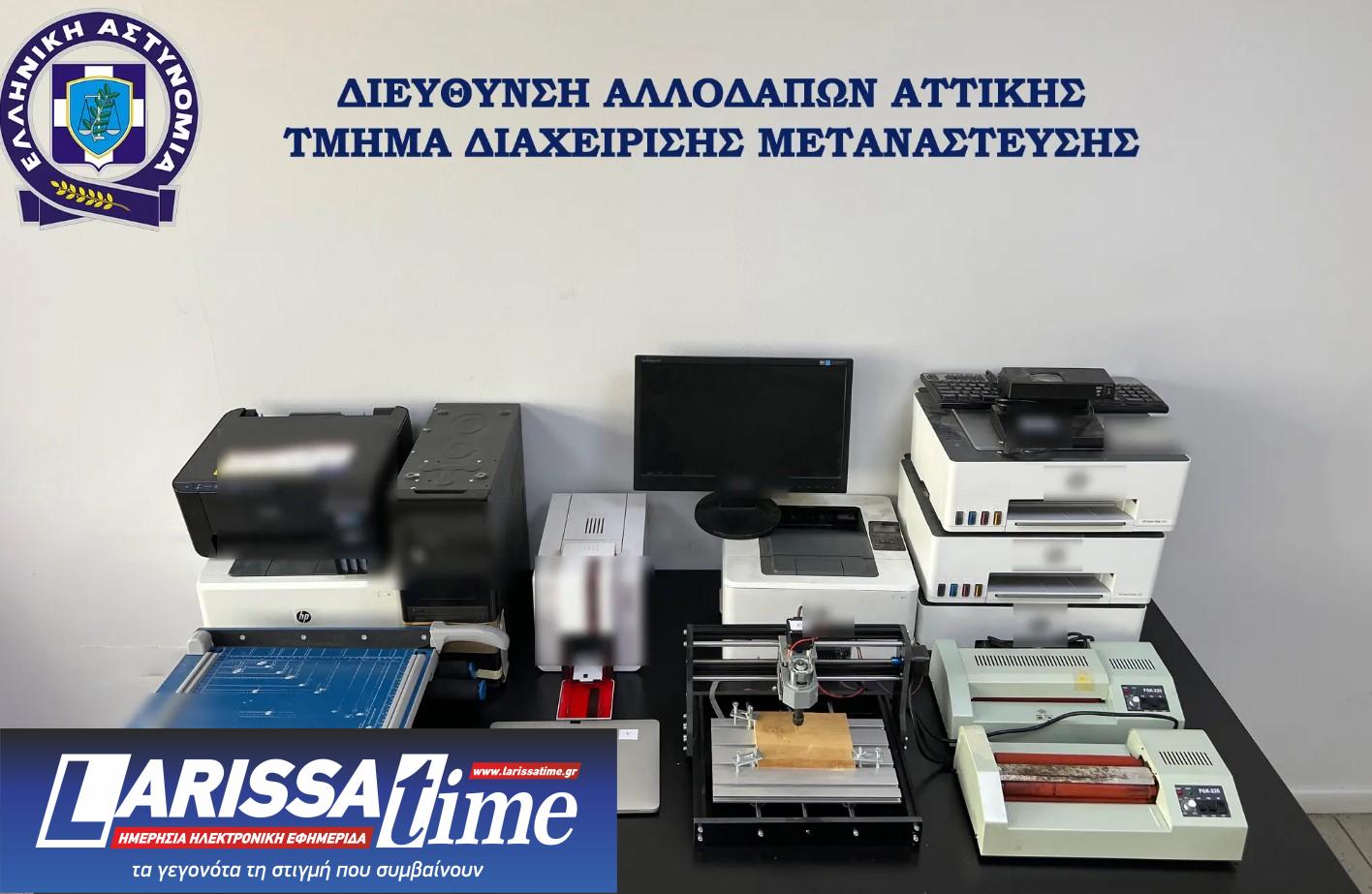 εξοπλισμός, όπως 2 ηλεκτρονικοί υπολογιστές, 6 πολυμηχανήματα – εκτυπωτές, 2 πλαστικοποιητές – θερμοκολλητές, 4 επιτραπέζιοι κόφτες χειρός, ηλεκτρονική συσκευή εγχάραξης διαφανειών CNC, συσκευή ανίχνευσης πλαστών εγγράφων UV, 8 ρολά ιριδίζουσας ταινίας, πλήθος αφαιρούμενων ψηφιακών μέσων,
