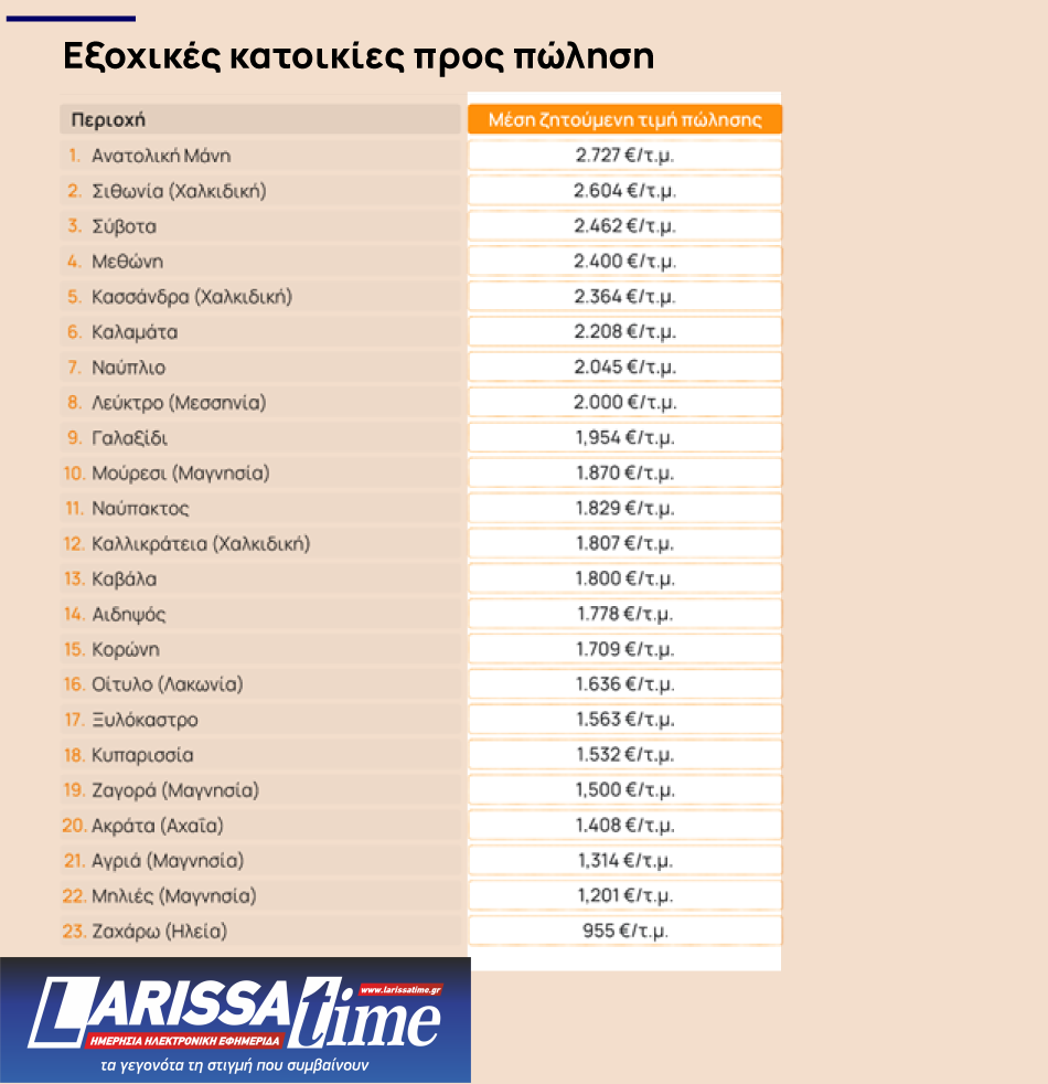 Αξιοσημείωτο είναι το ενδιαφέρον που εκδηλώνεται για αγορά εξοχικού στην ακτογραμμή της Αττικής και στα κοντινά νησιά, ενώ σε ό, τι αφορά την υπόλοιπη ηπειρωτική χώρα ως πιο ακριβές περιοχές αναδεικνύονται η Ανατολική Μάνη, η Σιθωνία και η Κασσάνδρα στη Χαλκιδική, τα Σύβοτα και η Μεθώνη στη Μεσσηνία.
