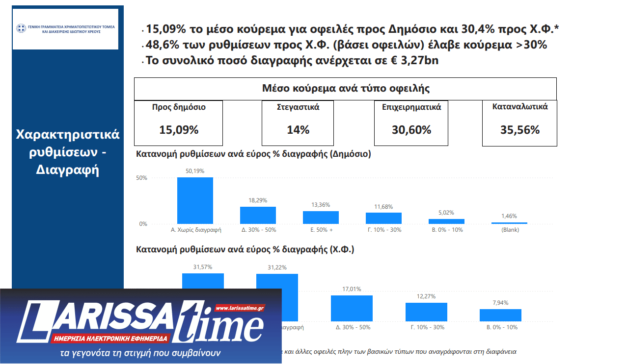 Το μέσο κούρεμα για οφειλές προς το δημόσιο διαμορφώνεται στο 15,09%, ενώ προς τους χρηματοδοτικούς φορείς (Χ.Φ) στο 30,4%. Αξιοσημείωτο είναι ότι περίπου οι μισές (48,6%) των ρυθμίσεων προς τους Χ.Φ. έλαβαν κούρεμα ένα του 30%, ενώ το συνολικό ποσό της διαγραφής ανέρχεται σε 3,27 δισ. ευρώ.