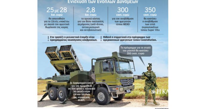 Οπως η «Κ» έχει ήδη υπογραμμίσει, ο νέος 12ετής μακροπρόθεσμος προγραμματισμός αμυντικών εξοπλισμών θα κυμανθεί σε κόστος μεταξύ 25 και 28 δισ. ευρώ.
