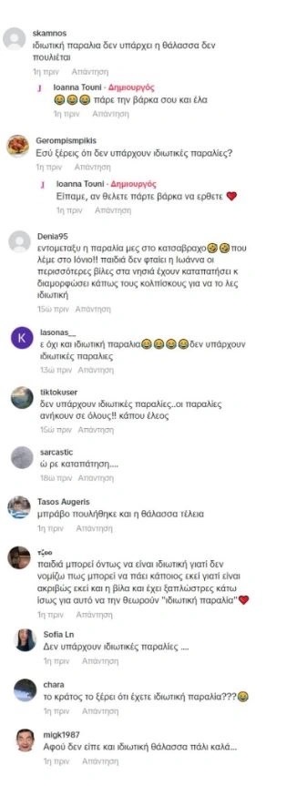 Η ανάρτηση προκάλεσε αντιδράσεις στους χρήστες του TikTok, οι οποίοι αμφισβήτησαν την ύπαρξη ιδιωτικών παραλιών. Κάποιοι σχολίασαν: «Δεν υπάρχουν ιδιωτικές παραλίες», «Αφού δεν είπε και ιδιωτική θάλασσα πάλι καλά» και «Oι παραλίες ανήκουν σε όλους».