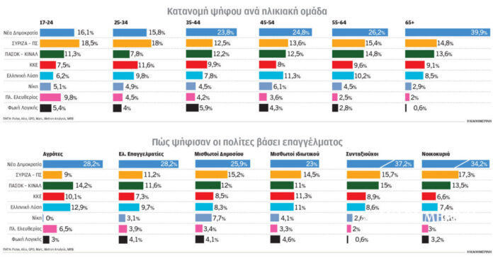 Μια πλήρη ακτινογραφία της κάλπης, του τρόπου που ψήφισαν οι πολίτες ανά κατηγορία –ηλικιακή, επαγγελματική, πολιτικής προέλευσης– δίνει η ανάλυση των δεδομένων του exit poll που πραγματοποιήθηκε την Κυριακή. Αποτυπώνεται από τα στοιχεία που συγκεντρώθηκαν και την επεξεργασία που έγινε η «ταυτότητα» των εκλογών και η προέλευση των ψηφοφόρων κάθε κόμματος.