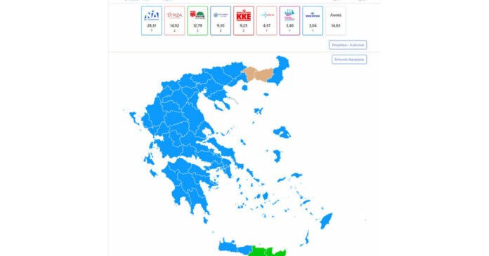 Η αλήθεια είναι πως υπάρχουν αρκετοί τρόποι για να «διαβάσει» κάποιος το εκλογικό αποτέλεσμα της 9ης Ιουνίου, προκειμένου να διαπιστώσει τη δυναμική ενός εκάστου κόμματος. Ενας εξ αυτών –επίσης χρωματιστός– προσφέρεται και μέσω της ειδικής σελίδας του υπουργείου Εσωτερικών, στη βάση των στοιχείων της Singular Logic και με την υποσημείωση πως «Τα στοιχεία δεν έχουν διασταυρωθεί με τα επίσημα στοιχεία των Πρωτοδικείων». Πρόκειται για τη μέθοδο ανάγνωσης της ψήφου των πολιτών, στην υποθετική περίπτωση ότι δεν συμμετείχαν στις εκλογές τα δύο μεγαλύτερα, σε εκλογική ισχύ, κόμματα: σύμφωνα με αυτή τη διαδικασία, το μεγαλύτερο μέρος της ηπειρωτικής Ελλάδας βάφεται πράσινο λόγω της εκεί «κυριαρχίας» του ΠΑΣΟΚ στον χώρο της ελάσσονος αντιπολίτευσης, επτά νομοί της κεντρικής Μακεδονίας αλλά και η δυτική Αττική σε «βαθύ μπλε» καθώς σε αυτές κυριαρχεί η Εληνική Λύση, ενώ τρία νησιά του Ιονίου, τέσσερα του Αιγαίου, η Α΄ και Β΄ Αθηνών, η Α΄ και Β΄ Πειραιώς στα κόκκινα, αφού εκεί μεγάλος νικητής μεταξύ των κομμάτων της αντιπολίτευσης (εξαιρουμένου του κόμματος της αξιωματικής αντιπολίτευσης) αναδείχθηκε ο Περισσός.