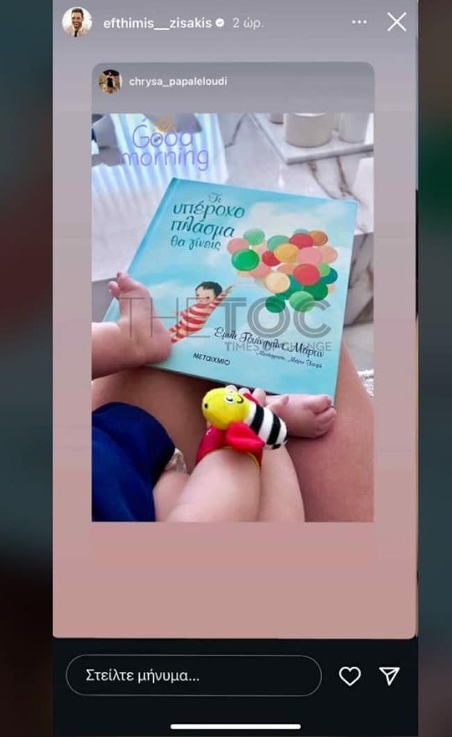 Πριν λίγες ημέρες, ο Ευθύμης Ζησάκης μοιράστηκε μία φωτογραφία του 4 μηνών γιου του από την ώρα που η μαμά του του διάβαζε παραμύθια.