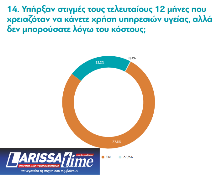 Το κόστος των υπηρεσιών υγείας φαίνεται ότι αποτελεί σημαντικό ζήτημα για ένα αξιοσημείωτο μέρος του πληθυσμού: 9 στους 10 (88%) δηλώνουν στην έρευνα ότι έκαναν χρήση υπηρεσιών υγείας τους τελευταίους δώδεκα μήνες. Ένα 22% όμως δήλωσαν ότι τον τελευταίο χρόνο υπήρξαν φορές που δεν έκαναν χρήση υπηρεσιών υγείας, τις οποίες χρειάζονταν, λόγω του κόστους. Όπως προκύπτει από την ανάλυση του Κυριάκου Σουλιώτη, εκείνοι που έχουν διαγνωστεί με χρόνιο πρόβλημα υγείας, είναι κατά 48% πιο πιθανό να μην μπορούν να κάνουν χρήση των υπηρεσιών υγείας λόγω κόστους. Αντίστοιχα, και οι γυναίκες έχουν 43% μεγαλύτερη πιθανότητα από τους άνδρες να δηλώσουν το ίδιο.