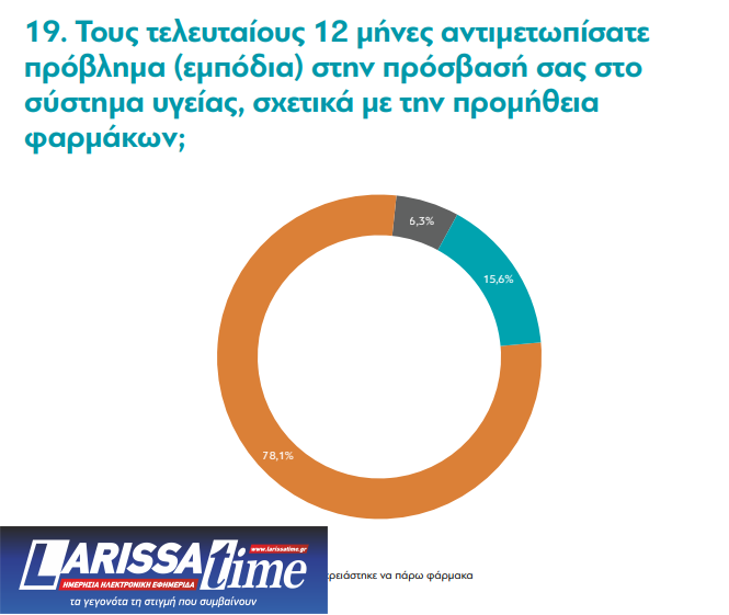 Η συντριπτική πλειοψηφία (93,3%) όσων κατανάλωσαν φάρμακα, απευθύνθηκαν σε ιδιωτικά φαρμακεία, ενώ η αμέσως επόμενη επιλογή ήταν τα φαρμακεία του ΕΟΠΥΥ, με 8,9%. Αλλά βρήκαν εκεί το φάρμακο που έψαχναν; Ένα 15,6%, δηλαδή περισσότεροι από 1 στους 6, δηλώνουν ότι αντιμετώπισαν εμπόδια στην προμήθεια φαρμάκων, με ένα πολύ σημαντικό μέρος εξ αυτών (88,3%) να επισημαίνει ότι οι δυσκολίες αφορούσαν στην εύρεση του προϊόντος που ήταν απαραίτητο για τη θεραπεία τους. Τα παραπάνω στοιχεία φανερώνουν ότι ένα αξιοσημείωτο μέρος του πληθυσμού αντιμετωπίζει εμπόδια στην πρόσβαση στο φάρμακο, είτε αυτά αφορούν στο κόστος είτε άλλους παράγοντες.