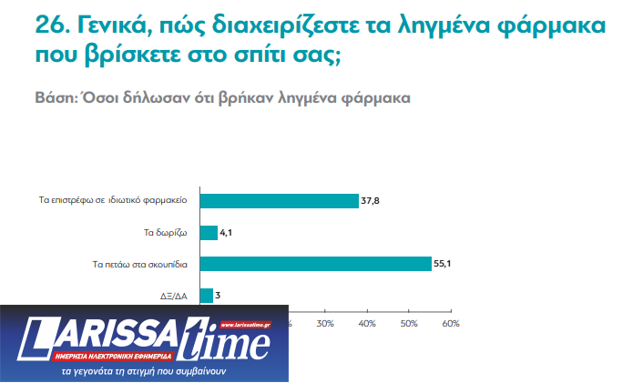 Τι κάνουν όμως με τα ληγμένα φάρμακα, αφότου τα εντοπίσουν στο σπίτι τους; Περισσότεροι από τους μισούς (55,1%) δηλώνουν ότι τα πετούν στα σκουπίδια, πράγμα που αποτελεί πρόκληση για την προστασία του περιβάλλοντος, ενώ 37,8% των ερωτώμενων δηλώνουν ότι τα επιστρέφουν στα φαρμακεία.