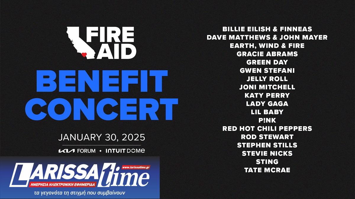 Η συναυλία FireAid Benefit έχει οριστεί για τις 30 Ιανουαρίου και θα πραγματοποιηθεί σε δύο χώρους στο Ίνγκλγουντ, στο Intuit Dome και στο Kia Forum, με συμμετέχοντες τους Στίβι Νικς, Τζόνι Μίτσελ, Κέιτι Πέρι, Μπίλι Άιλις, Ροντ Στιούαρτ, Lady Gaga, P!NK, Sting, Red Hot Chili Peppers, Green Day και Earth, Wind, & Fire.