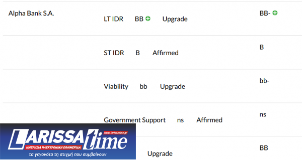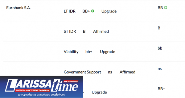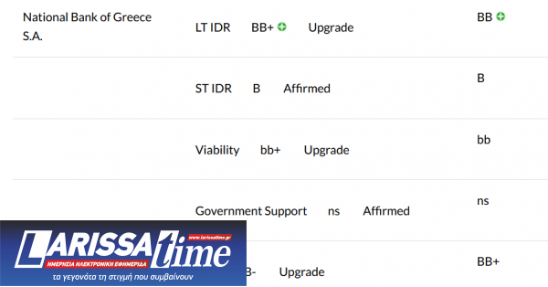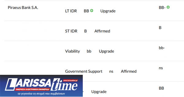 Ειδικότερα, για την Εθνική Τράπεζα και την Eurobank, η Fitch αναβάθμισε τη Μακροπρόθεσμη Αξιολόγηση (IDR) τους σε «BB+» από «BB», ενώ για την Alpha Bank και την Πειραιώς η αναβάθμιση είναι στο BB από ΒΒ- προηγουμένως.
