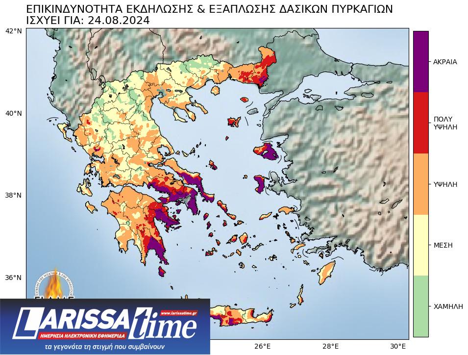 Ακραία επικινδυνότητα εκδήλωσης και εξάπλωσης δασικών πυρκαγιών στην κεντρική Ελλάδα και τα νησιά του Βορείου και Νοτίου Αιγαίου παρατηρούμε για την Παρασκευή και το Σάββατο (23 και 24 Αυγούστου) σύμφωνα με την πρόγνωση πυρομετεωρολογικής επικινδυνότητας (FLAME) του Εθνικού Αστεροσκοπείου Αθηνών/Meteo.gr με βάση το Καναδικό Σύστημα Πυρομετεωρολογικών Δεικτών (Canadian Forest Fire Weather Index System – CFFWIS), προσαρμοσμένο στο πυρικό περιβάλλον της Ελλάδας.