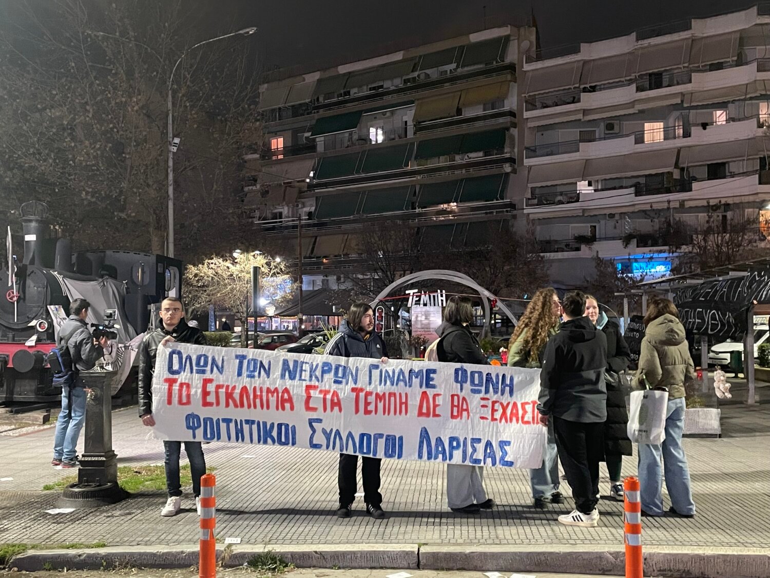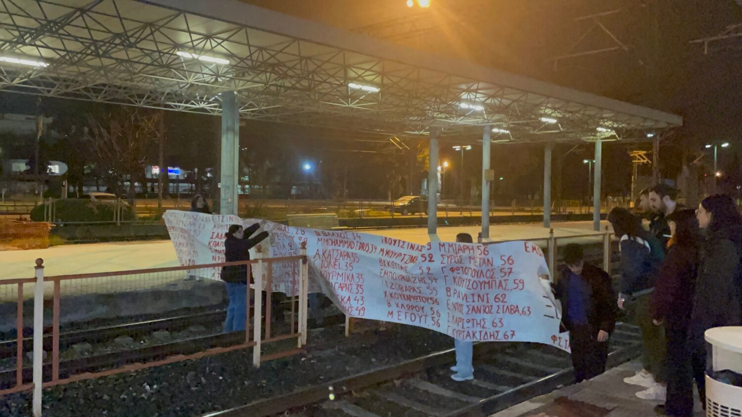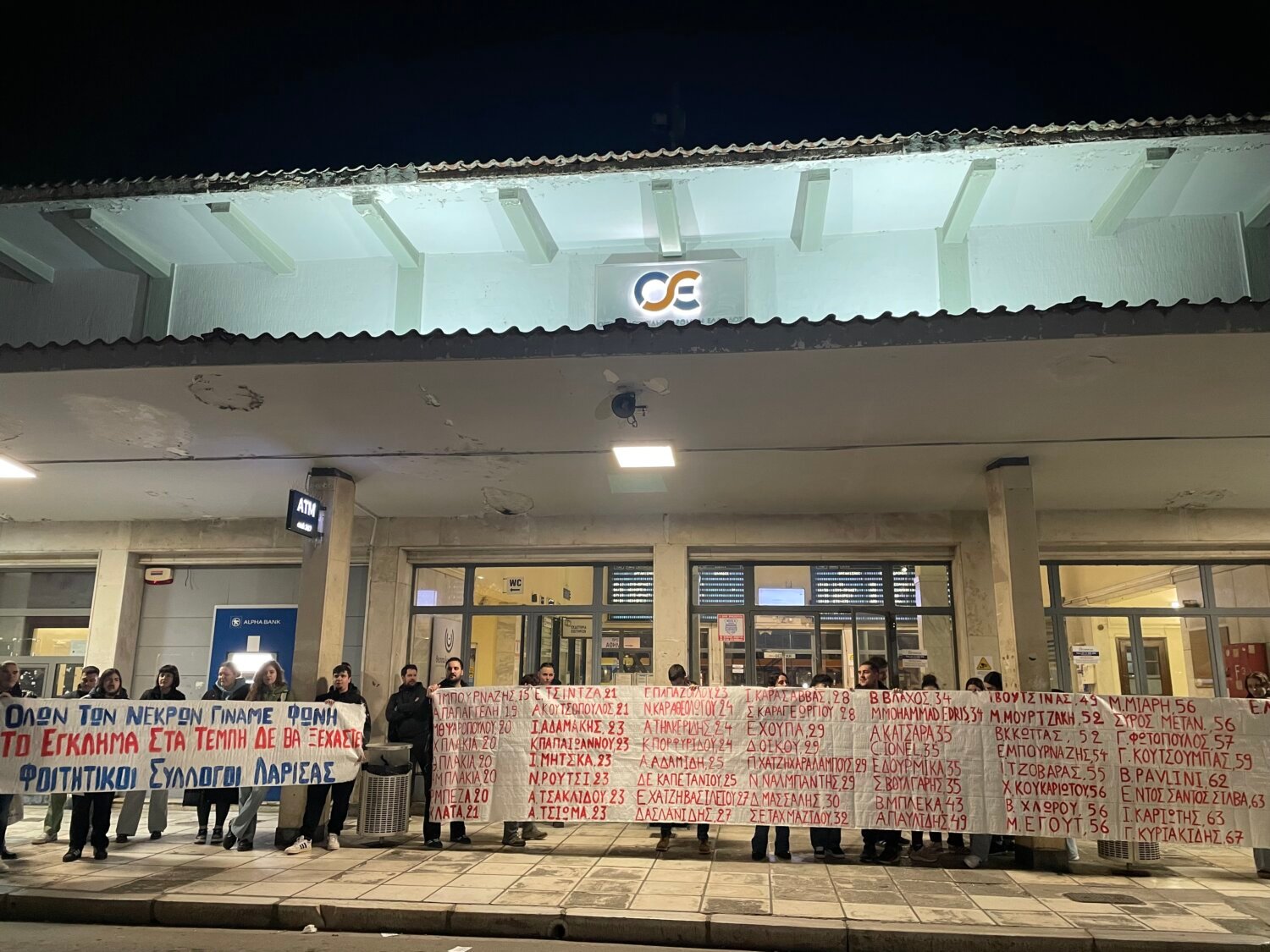 Κλειστές ήταν οι σιδηροδρομικές γραμμές μπροστά από τον Σταθμό του ΟΣΕ στη Λάρισα, το απόγευμα της Πέμπτης (27/02), καθώς φοιτητές της Ιατρικής που σπουδάζουν στην πόλη, τις απέκλεισαν με πανό όπου αναγράφονταν τα ονόματα των 57 θυμάτων της τραγωδίας των Τεμπών.