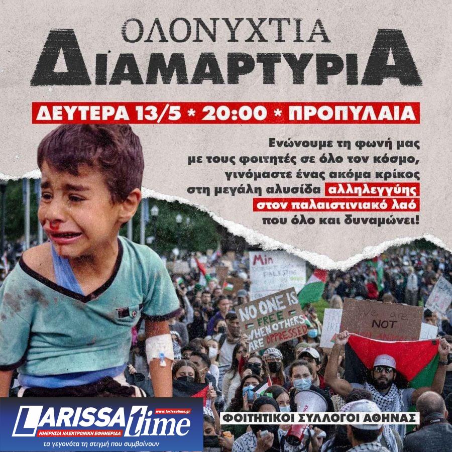 Φοιτητές με κάλεσμα των φοιτητικών συλλόγων Αθήνας και Θεσσαλονίκη, προχωρούν τη Δευτέρα 13 Μαΐου σε ολονύκτιες διαμαρτυρίες, «ενάντια στην σφαγή του Παλαιστινιακού λαού», σε Προπύλαια (στις 8 το βράδυ) και Λευκό Πύργο (στις 7 μ.μ.). Την ίδια μέρα το πρωί θα πραγματοποιήσουν πολύμορφες δράσεις μέσα στις σχολές.