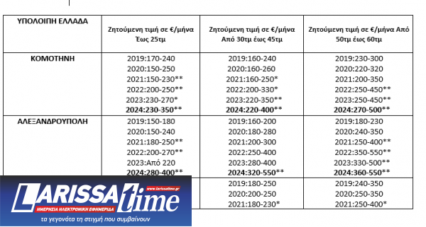 Σε πανελλαδικο επίπεδο, με βάση τις ιστοσελίδες αγγελιών, καταγράφεται αύξηση των διαθέσιμων ακινήτων στα υψηλότερα μισθώματα και συρρίκνωση στα οικονομικότερα, σημειώνει η έρευνα του Πανελλαδικού Δικτύου Ε-real Estates. Η αύξηση της διαθεσιμότητας φοιτητικών κατοικιών στα υψηλότερα ζητούμενα μισθώματα, «αντανακλά» μια μεσοσταθμική αύξηση των ζητούμενων τιμών που αγγίζει ακόμη και το 10%-15% στα ανακαινισμένα και πλήρως εξοπλισμένα διαμερίσματα. Όσον αφορά, τις κατώτατες ζητούμενες τιμές μίσθωσης, καταγράφονται αυξητικές τάσεις της τάξεως του 8%-12% σε σχέση με πέρυσι.